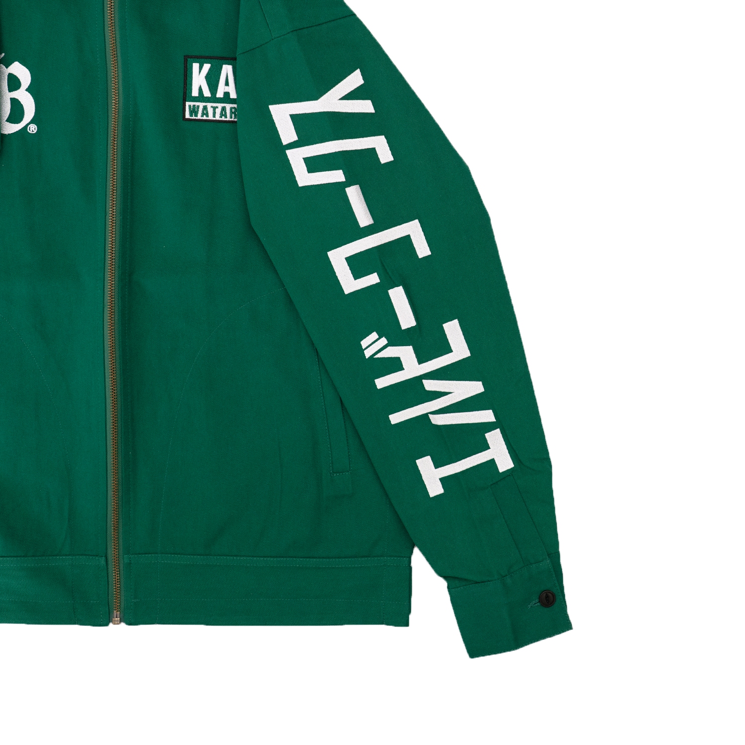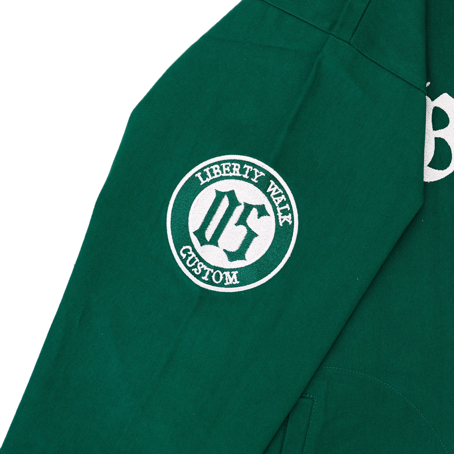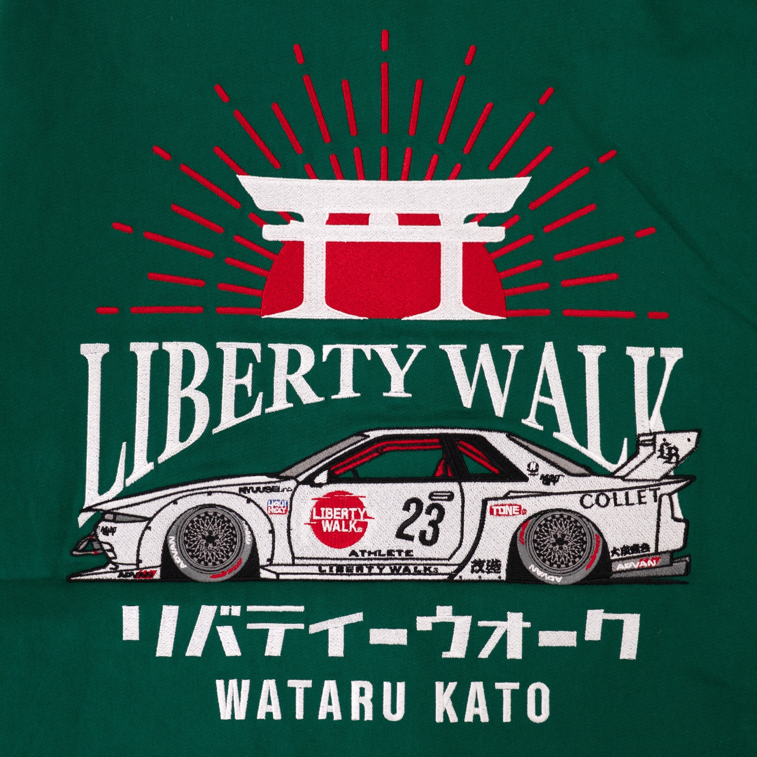 和のテイストを大胆に落とし込んだLIBERTY WALKジャケット。背面には鳥居モチーフとLB-KAIDO WORKS R32のマシングラフィック、フロントにはLBロゴとKATOネームパッチを配置。存在感抜群でストリートにも映える一着。